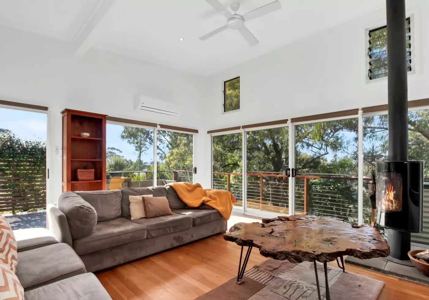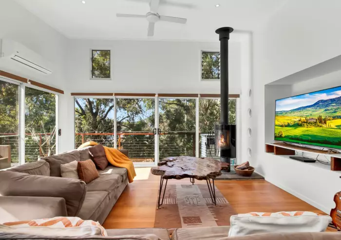 - Light-filled open-plan living with high ceilings, fireplace, A/C and ceiling fans