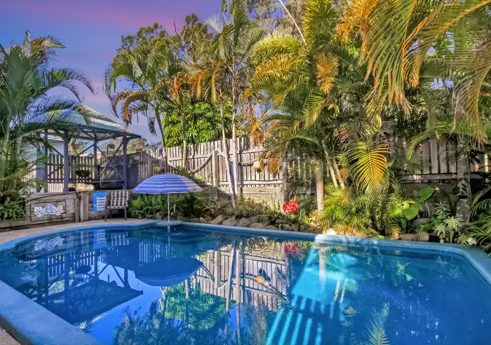 - Huge entertainers’ deck plus in-ground saltwater pool with tropical surrounds and covered entertaining area