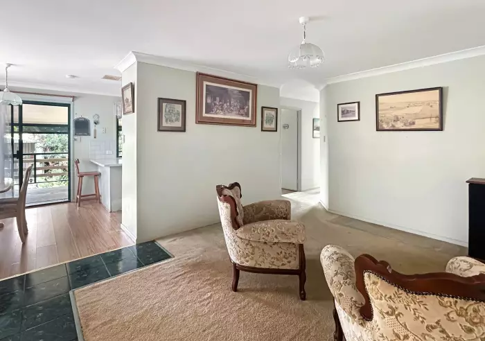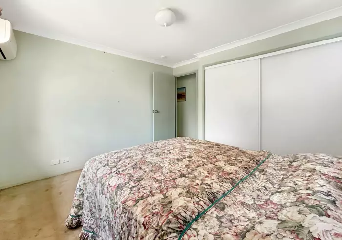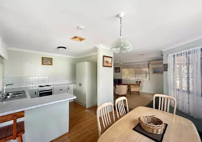Step inside to an enclosed front deck with mesh, the perfect spot for your morning coffee. The lounge is comfortable and inviting, featuring air conditioning and carpet flooring. The kitchen and dining area offers ample cupboard space, a pantry, and electric cooking, with lovely views over the backyard.