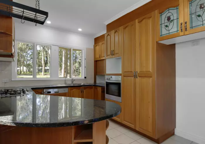 The kitchen is full of character with timber cabinetry and leadlight glass features, along with a gas cooktop and separate electric wall oven. Two bathrooms add practicality — one with a shower over bath and the other with a convenient two-way shower.
