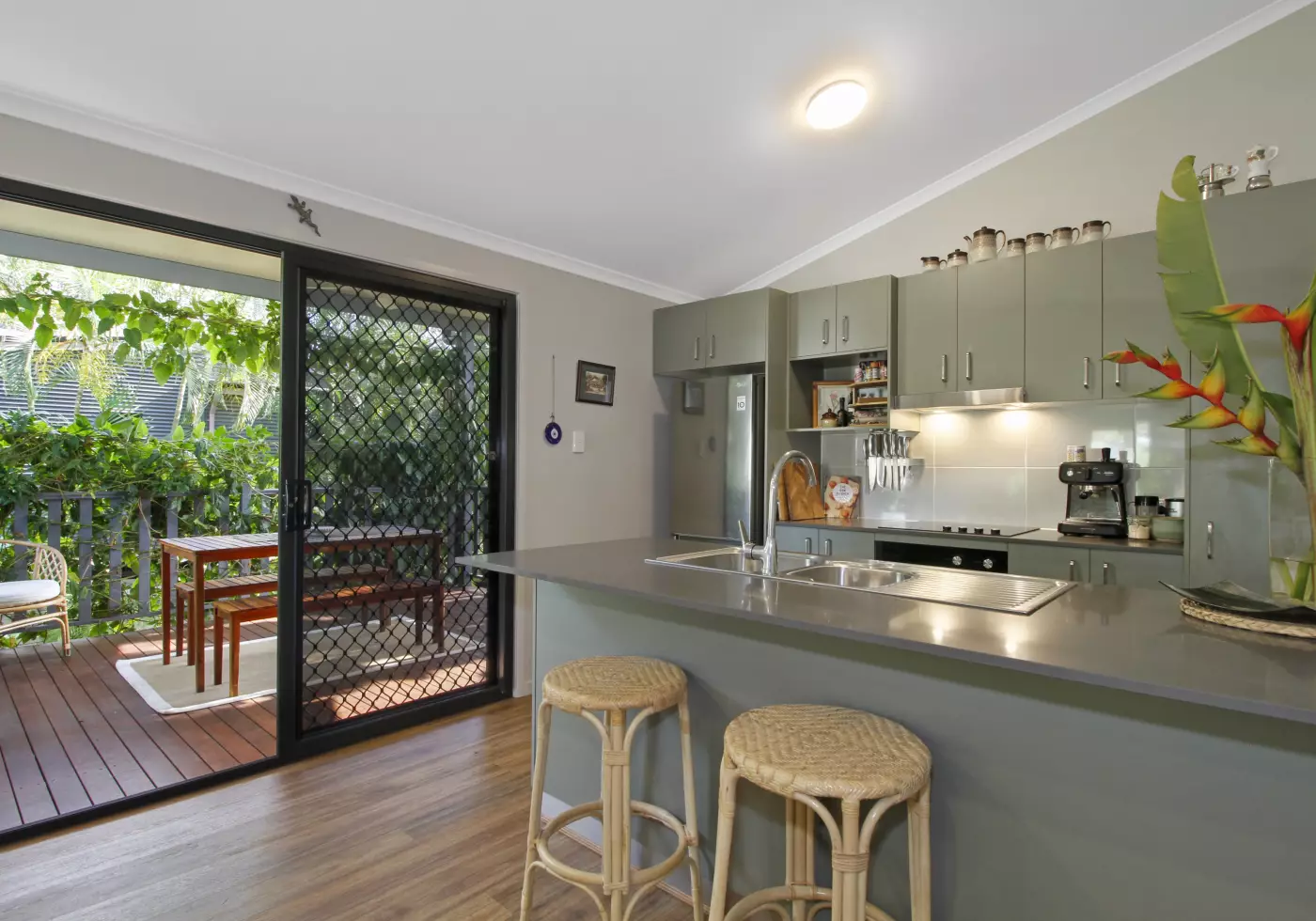 Enjoy private decks perfect for relaxing, and a backyard featuring lush, edible tropical gardens that add a touch of sustainability.