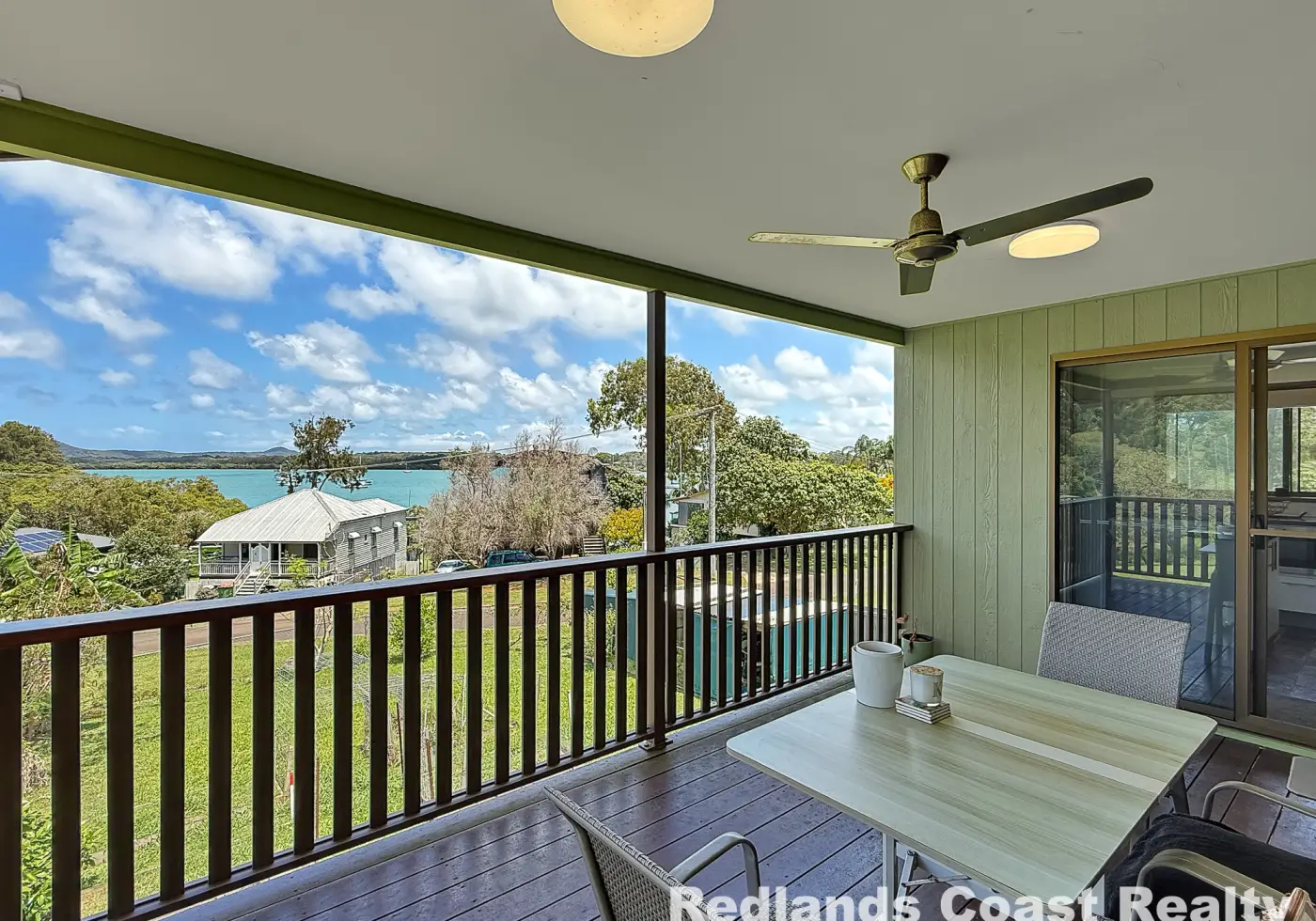 Spacious living zones include formal dining, a cosy wood burner, and a light-filled upper living area that opens through wide stacker doors onto a covered verandah — an ideal spot for alfresco meals while soaking up the water vista. The home is cooled naturally with cross-breezes and fans throughout.
