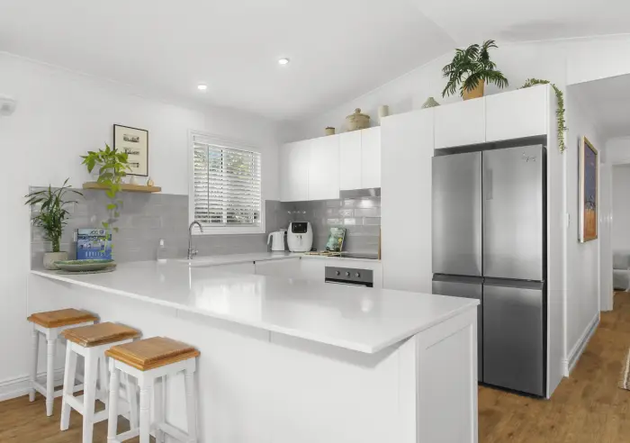 Light-filled and beautifully finished, the open-plan living space flows seamlessly to a large entertaining deck, perfect for catching the sea breezes, hosting a barbecue, or unwinding with an afternoon drink as the sun sets. Quality hybrid vinyl flooring, a stylish and well-appointed kitchen, and a gorgeous modern bathroom elevate the home’s contemporary beachy vibe.