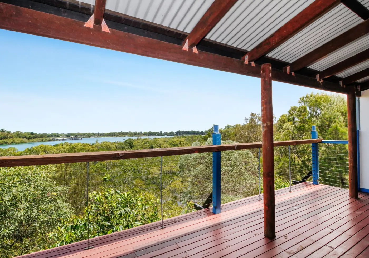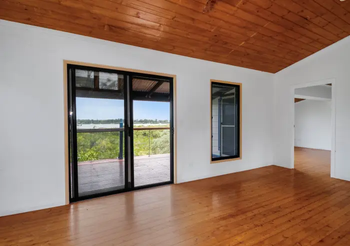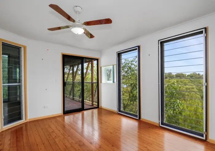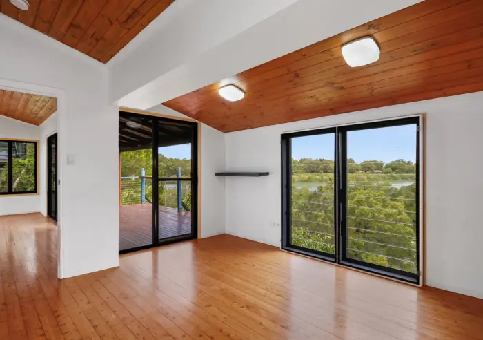 Down the internal stairs are two separate private rooms, each enjoying water views and direct deck access, ideal for guests, a home office, or creative spaces.