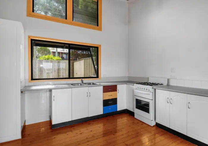 Upstairs, the home welcomes you with a light-filled lounge, kitchen, bathroom with laundry, and the main bedroom. Step out onto the deck from the lounge and take in the ever-changing water views – the perfect spot for morning coffees and watching the ferries pass by. Lovely timber flooring flows throughout the home, adding warmth and character.