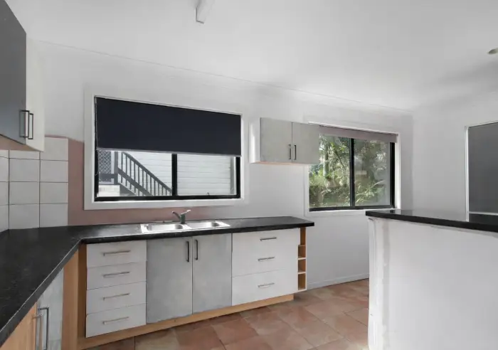 Upstairs, the home features a generous open plan lounge and dining area that extends onto the front deck, creating a relaxed space to enjoy the outlook and island breezes. Two bedrooms sit on this level, separated by a two-way bathroom, with the master bedroom opening directly onto the deck. Solar is already in place, adding a practical touch to everyday living.